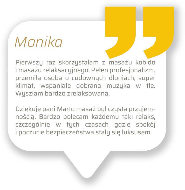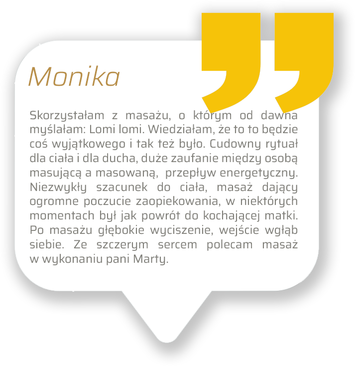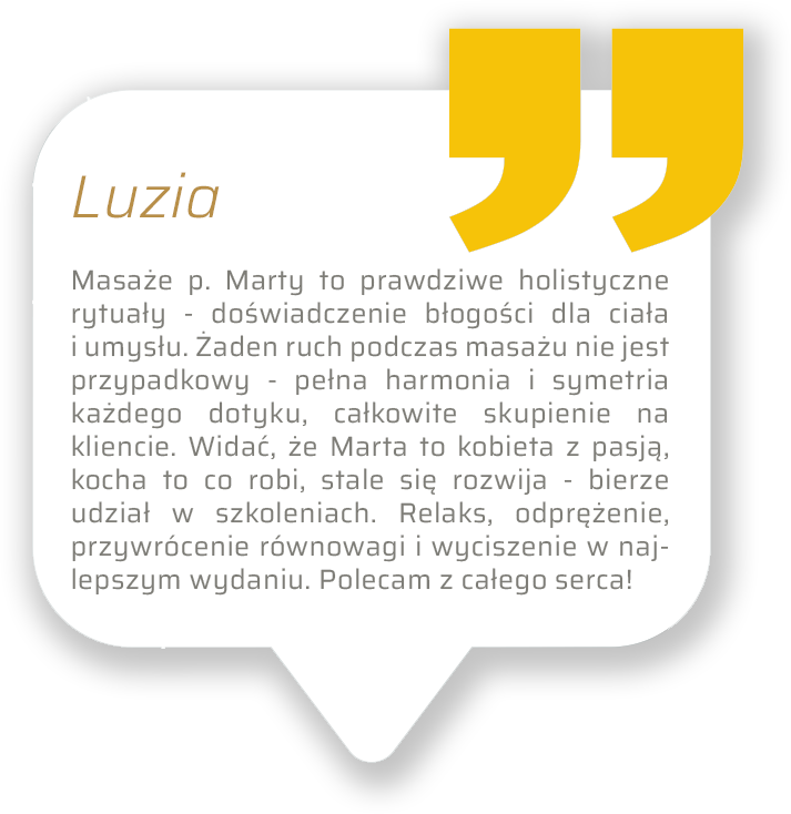 Ponadto, w gabinecie masażu w Bydgoszczy od lat zgłębiam orientalne techniki poprawiające jakość życia (Lomi Lomi Nui, Abhyanga, Marma Abhyangam, Kobido, Zoga Face Integrationn, masaż Transbukkalny itp). Dbałość o każdy szczegół w studio sprawia, że klienci wybierający moje usługi mogą cieszyć się harmonią ducha i ciała relaksując nie tylko mięśnie, ale także i umysł. Dzięki mojemu bogatemu doświadczeniu i holistycznemu podejściu do człowieka, na pewno doznasz głębokiego odprężenia, znacząco podniesiesz własną odporność, a także zapomnisz o codziennym zgiełku. Wybierając masaż w Bydgoszczy lub Prądkach doświadczysz spokoju w wyjątkowej atmosferze i nabierzesz sił na kolejne wyzwania. Certyfikowana terapeutka przeniesie Cię w podróż po egzotycznych zakątkach świata.